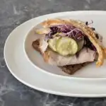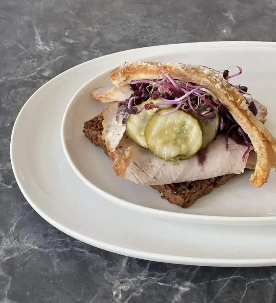 Flæskesteg med knasende svær, med et lag af sød og syrlig rødkål og agurkesalat, der giver en frisk kontrast til den lækre steg. En klassiker, der aldrig går af mode.