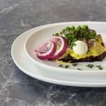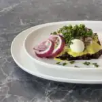 Karrysild med rødløg. En klassisk dansk delikatesse med et moderne twist. Frisk sild i en fyldig og smagfuld karrydressing, toppet med sprøde rødløg og purløg for en perfekt balance af syrligt og krydret. Perfekt til frokostbordet